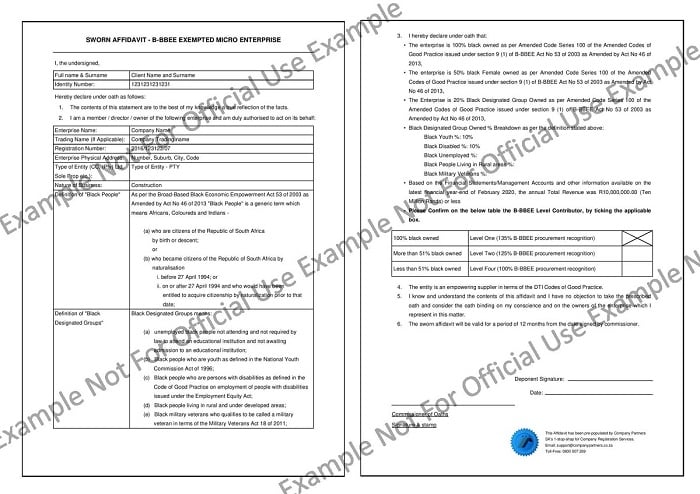 A B-BBEE Affidavit is: A simple document that states what your level of Black Ownership is. You can simply fill out a free B-BEE Affidavit template accurately and then have it signed and stamped by an official Commissioner of Oath. Once officiated, this will serve as your official B-BBEE Certificate until you hit the R10 million mark of annual turnover. Then it’s compulsory for you to get an official B-BBEE Certificate. A B-BBEE Certificate is: The document you need if your company earns (its sales are) R10 million or more per year. If your annual turnover is above R 10 million per year and you require a BEE certificate, then please visit our BEE certificate page here. A Certificate issued by SANAS after your Company has gone through a verification process through a Verification Agency. You can read more about the CIPC’s regulation on BEE Certificates and Affidavits for SMEs. Just complete the sign-up form here to get your free professional BEE Affidavit.